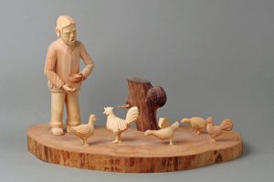 Ein Kötter hat einen Hahn, eine Henne und zwei Junghühner. Diese hat er zum Fressen angelockt. Dem Lockrufen ist auch ein Zwerghahn aus der Nachbarschaft gefolgt. Von einem der Junghühner wird er attackiert.